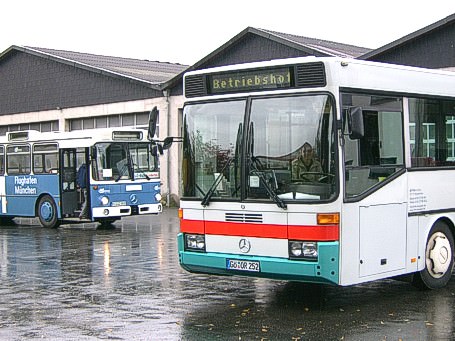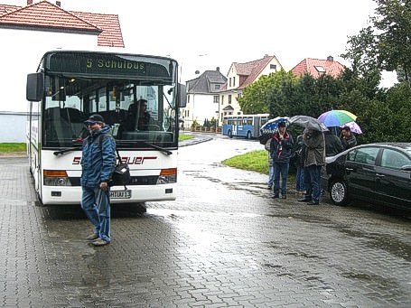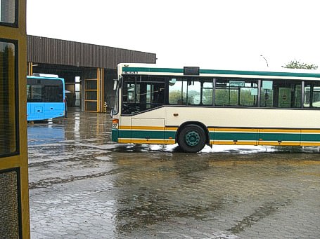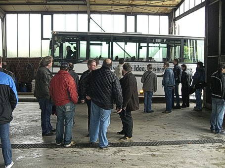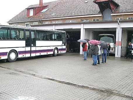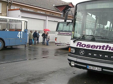 Anschließend besuchten wir den Betriebshof der Firma Rosenthal. Ein ungewohntes Bild bot sich hier: Unser MB-Gelenkbus parkte direkt neben den Setra-ULs der Firma. Herr Ratswohl rangierte die Busse nach unseren Wünschen und bewies, dass Sauberkeit auch an Regentagen oberstes Gebot ist.