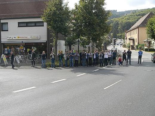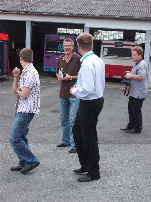 Die erste Etappe führte uns zur Fa. Regiobus Uhlendorff GmbH & Co. KG nach Oberweser-Gieselwerder. Der dortige Fahrzeugpark umfasst eine bunte Mischung aus Bussen der Marken Mercedes, Volvo und MAN. Die Stimmung auf dem Betriebshof war bestens, was auch das Treffen mit T. Uhlendorff und M. Eickhoff bestätigte. Beim anschließenden Fotohalt wurde die Ortsmitte von Gieselwerder kurzzeitig von uns "besetzt".