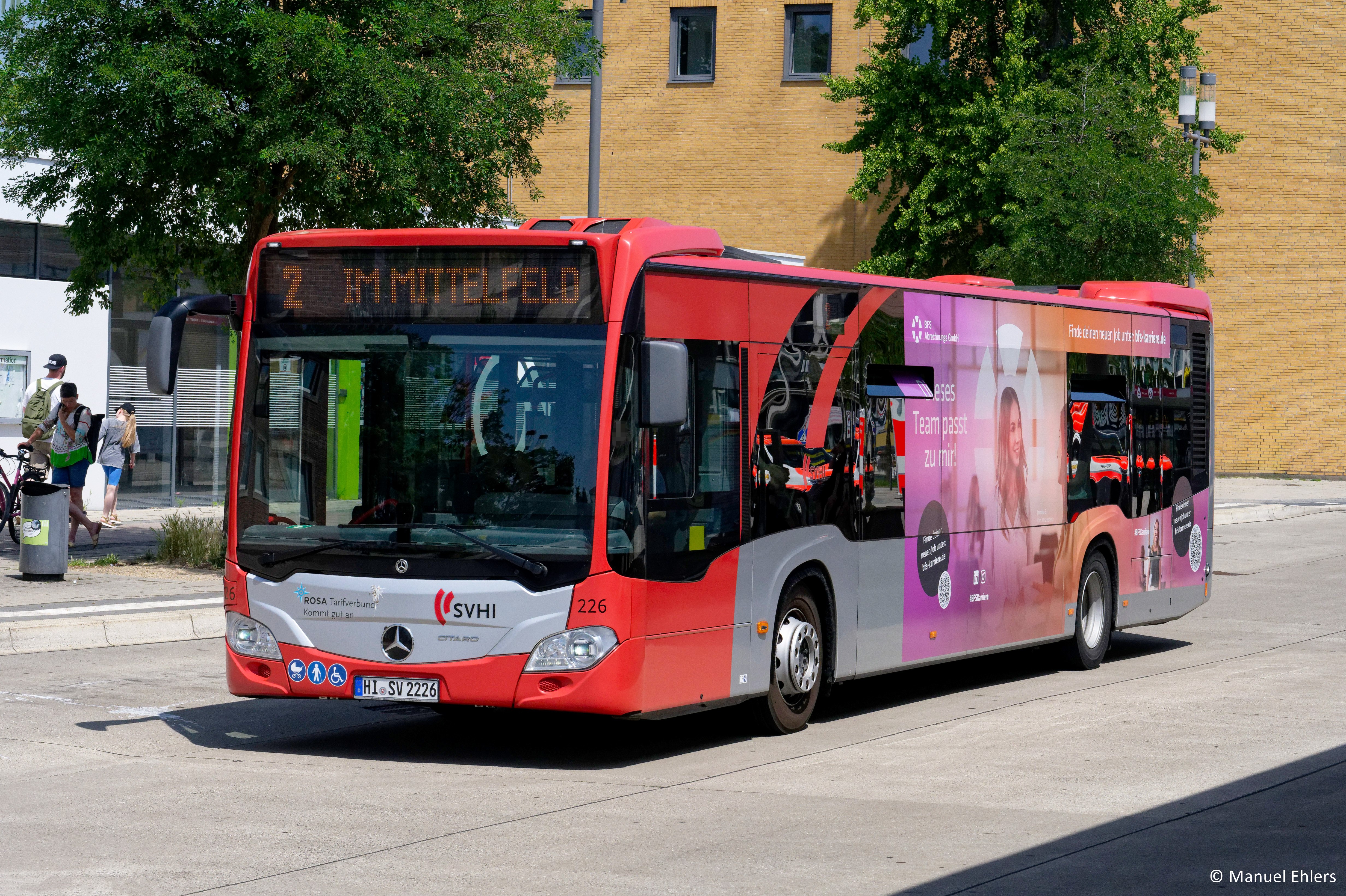 Der Wagen 226 hat die Werbefläche für "BFS-Karriere" mittlerweile verloren. Im Sommer letzten Jahres zeigte sich der Omnibus am Bahnhof in Hildesheim mit der gestalteten Werbefläche.